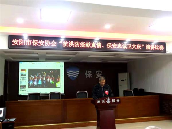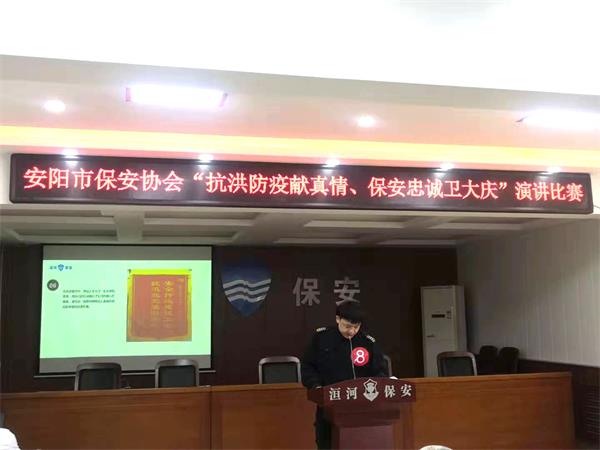 9月28日下午,安陽市保安協(xié)會舉行了“抗洪防疫獻(xiàn)真情、保安忠誠衛(wèi)大慶”演講比賽。安陽市公安局保安監(jiān)管隊長齊超杰、安陽市保安協(xié)會會長魏東、安陽市保安協(xié)會副會長秦伏江、安陽市保安協(xié)會副會長靳才周、安陽市保安協(xié)會秘書長李玉祥和會員代表共40余人參加活動。來自安陽市保安系統(tǒng)的14名會員單位選手參加比賽,洹河保安公司守押分公司的劉雷波脫穎而出,榮獲演講比賽一等獎,劉慶宏榮獲二等獎,人防四大隊的王亞楠榮獲三等獎。