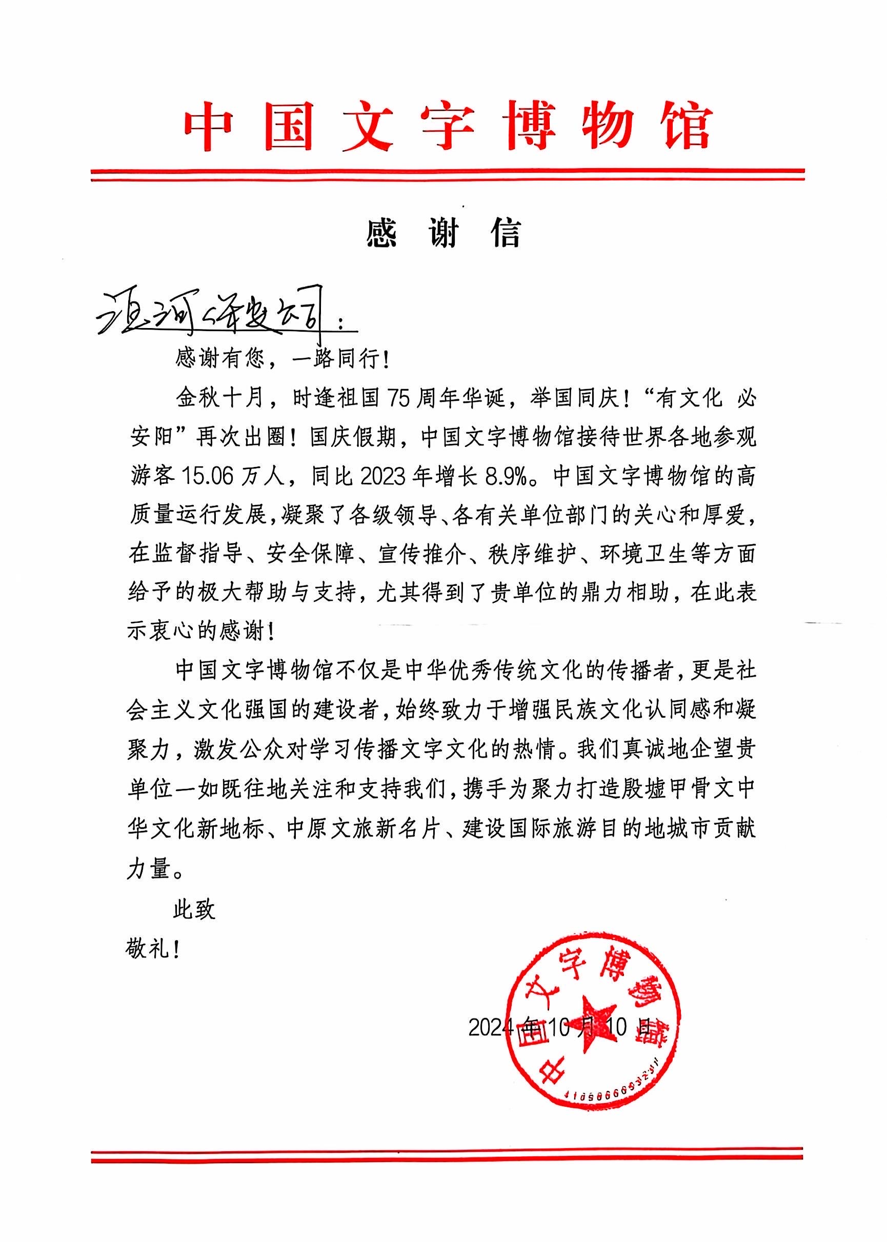 10月12日,中國(guó)文字博物館安全保衛(wèi)部主任孫琳杰專程來到我公司,送來一封感謝信,以此感謝今年國(guó)慶期間公司在安全保衛(wèi)工作中所付出的努力和作出的貢獻(xiàn)。此次國(guó)慶期間,中國(guó)文字博物館接待世界各地參觀游客15.06萬人次,參觀人數(shù)多、時(shí)間長(zhǎng)、影響面廣,公司全體保安員盡職盡責(zé),嚴(yán)格落實(shí)各項(xiàng)安保措施,以飽滿的熱情和敬業(yè)的工作態(tài)度,為博物館安全作出了積極貢獻(xiàn)。