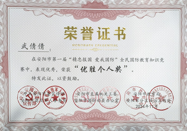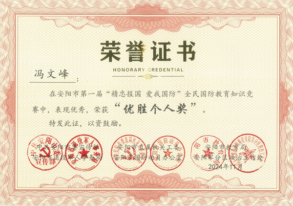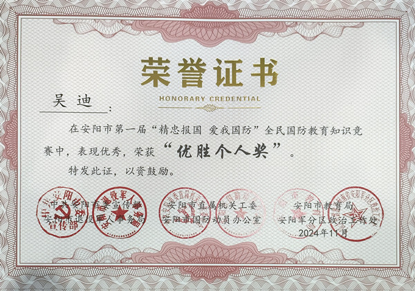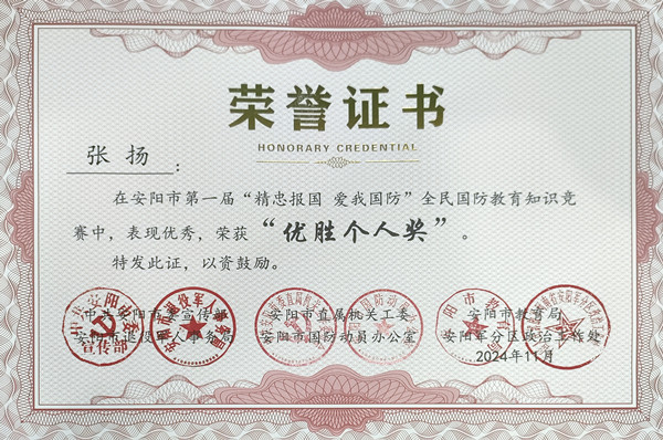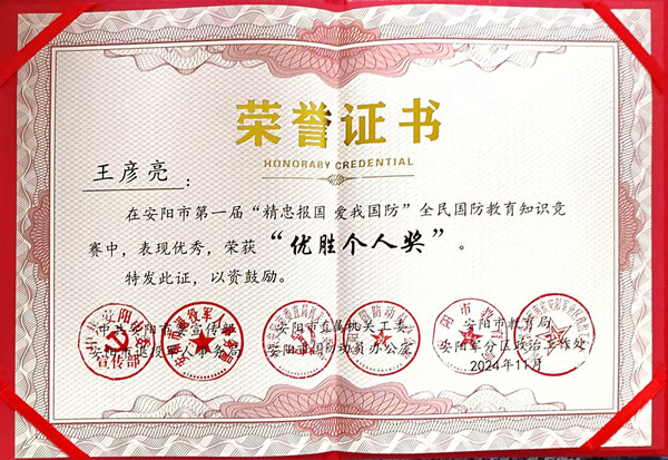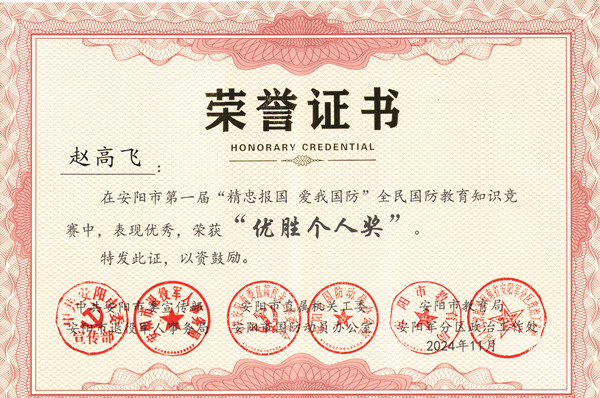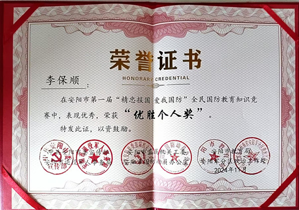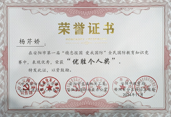 近日,安陽市******屆“精忠報國 愛我國防”全民國防教育知識競賽圓滿落幕,公司馮文峰、李保順、王彥亮、趙高飛、張揚、楊芹嬌、吳迪、武倩倩等8名同志榮獲“優(yōu)勝個人獎”。