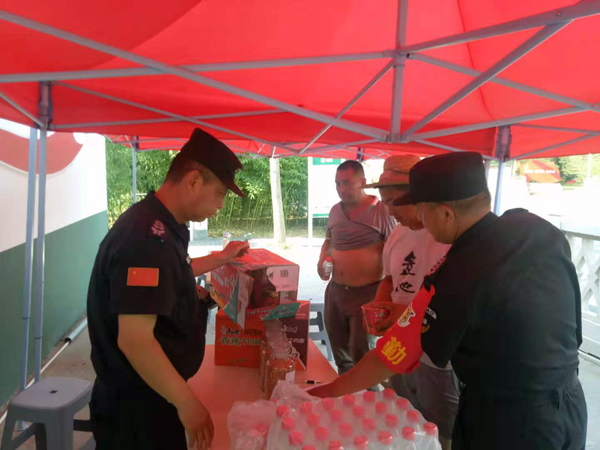 由于高溫干旱,防火成為糧庫的首要工作。保安員犧牲休息時間配合中儲糧,聯(lián)合公安、消防等部門開展消防安全大檢查并開展消防安全演練,增強了消防安全意識,提升了消防滅火能力。為確保出入糧庫車輛有序、安全,隊員每天早來晚歸,維護糧庫大門口秩序??吹郊Z農(nóng)排隊售糧,保安班長馮秋森安排隊員架設愛心涼亭,擺放愛心座椅, 備足熱水、礦泉水等防暑降溫用品,讓糧農(nóng)使用,防止中暑。他們又準備了方便面分發(fā)到糧農(nóng)手中,解決他們的用餐。
