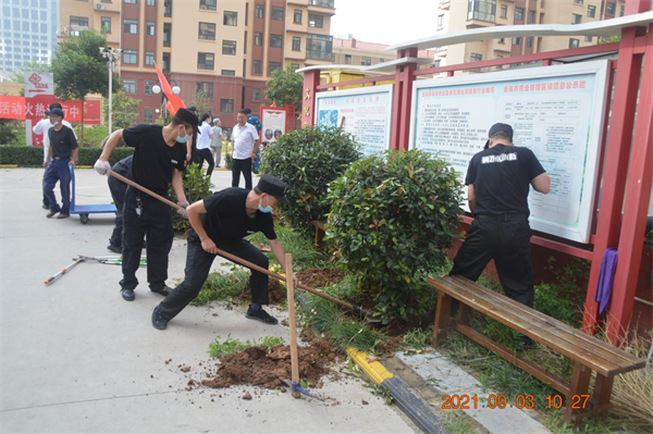 當(dāng)日,8時(shí)30分,會(huì)戰(zhàn)現(xiàn)場,黨旗飄揚(yáng),紅旗獵獵。根據(jù)小區(qū)實(shí)際情況,戰(zhàn)前作了劃分區(qū)域,任務(wù)分解,按項(xiàng)目單位分工作戰(zhàn)。指揮員一聲令下,會(huì)戰(zhàn)開始。頓時(shí),金鼎園綠地草坪,園內(nèi)空地,人聲鼎沸,機(jī)器轟鳴。有持割草機(jī)清理草地,有拿綠籬機(jī)整理綠化帶,有揮鎬挖樹,有操剪刀修整花卉樹木,有拔草,有清運(yùn)垃圾,分工明確,忙碌有序,秩序井然。會(huì)戰(zhàn)中大家汗流滿面,衣服被汗水浸透。小區(qū)許多熱心業(yè)主也都紛紛投入到清理環(huán)境的活動(dòng)中。業(yè)主6號(hào)樓樓長黃小新、黃鳳英,忙前忙后,為物業(yè)員工提供會(huì)戰(zhàn)服務(wù)送來了礦泉水,業(yè)主安鋼職工謝小飛熱心為員工們購買了好幾箱冰棍,滿足提供給參戰(zhàn)員工解渴消暑。真正體現(xiàn)了物業(yè)與業(yè)主一家親,物業(yè)與業(yè)主濃濃的魚水之情。