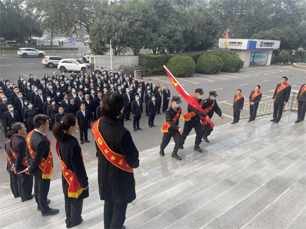 11月1日,建行安陽分行舉行每月首日的升旗儀式。此次升旗儀式邀請?zhí)乇4箨?duì)大隊(duì)長牛曉波主持,派駐建行門崗特保隊(duì)員為旗手,守押隊(duì)員協(xié)助