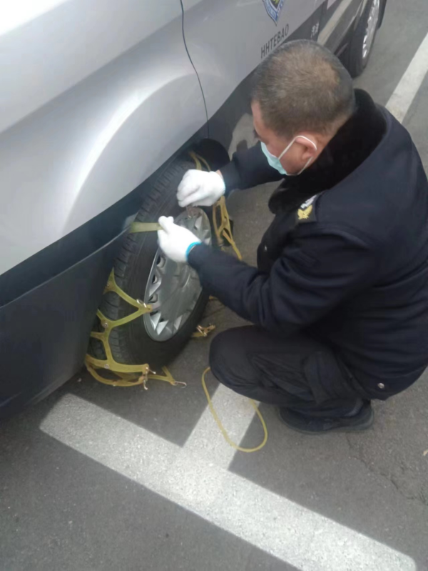 演練現(xiàn)場(chǎng),大隊(duì)領(lǐng)導(dǎo)從防滑鏈的安裝、使用方法、冬季行車注意事項(xiàng)及正確應(yīng)對(duì)冰雪等惡劣天氣防范措施等方面進(jìn)行詳細(xì)講解。各車組人員按照規(guī)范程序,將防滑鏈安裝到車輛輪胎上,然后用繃帶將防滑鏈交叉固定,確保車輛在運(yùn)行中防滑鏈更加牢固。