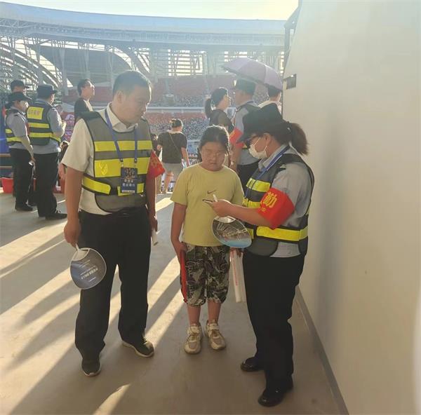 勤務(wù)實施前,大隊成立了大隊長王向煜任組長的安全保衛(wèi)工作領(lǐng)導(dǎo)小組,其他成員依照方案抽調(diào)執(zhí)勤力量,明確任務(wù)分工。勤務(wù)當(dāng)天下午,各執(zhí)勤單位提前到達預(yù)定位置集結(jié)到位,整理隊伍分發(fā)裝備,按時進入執(zhí)勤崗位。除安排20人編入應(yīng)急機動隊外,其余負(fù)責(zé)D1和E1區(qū)觀眾席的秩序維護。面對炎炎烈日,大家毫無怨言,依然堅守崗位,對具體崗位任務(wù)落實到具體人員。給群眾提供了力所能及的幫助。下午6點半,李會芳發(fā)現(xiàn)一女孩啼哭不止,便上前詢問。當(dāng)?shù)弥⑹桥c家長走失時,報告帶隊領(lǐng)導(dǎo)尚斌,并幫她打電話聯(lián)系到家長,使其與家人團聚。