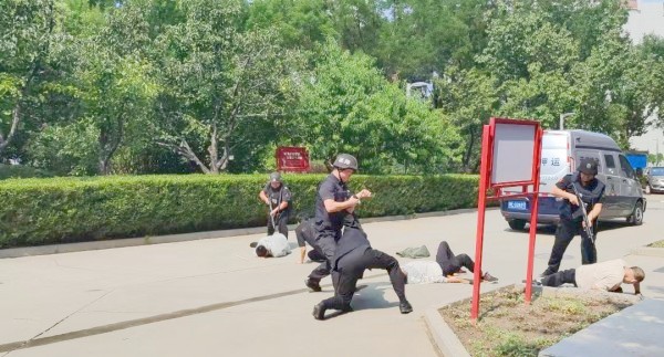 演練內(nèi)容以5名不法分子企圖在銀行網(wǎng)點(diǎn)門口乘押款員裝卸款箱時(shí)進(jìn)行搶奪款箱為背景,開展防盜搶預(yù)案演練。面對(duì)歹徒,車組人員各司其職,快速反應(yīng),駕駛員立即向駐地隊(duì)長報(bào)告,大隊(duì)長迅速下達(dá)啟動(dòng)應(yīng)急預(yù)案的指令,并向銀行保衛(wèi)部門報(bào)告;同時(shí)守押隊(duì)員毫不畏懼,迅速行動(dòng)控制歹徒,確保人員及款箱安全。
