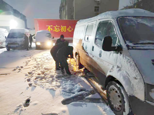 命令下達,隊員們紛紛出動,冒著嚴寒、頂著大雪,小心翼翼的趕到大隊,進行出車前的準備工作。隊員們配合默契、行動迅速,司機在大隊領(lǐng)導(dǎo)的帶領(lǐng)下給押運車輛安裝防滑鏈;隊員在車長的指揮下拿起鐵鍬,鏟除積雪;還有一些隊員在清理駐地路面,撒上化雪鹽,確保正常出車。
