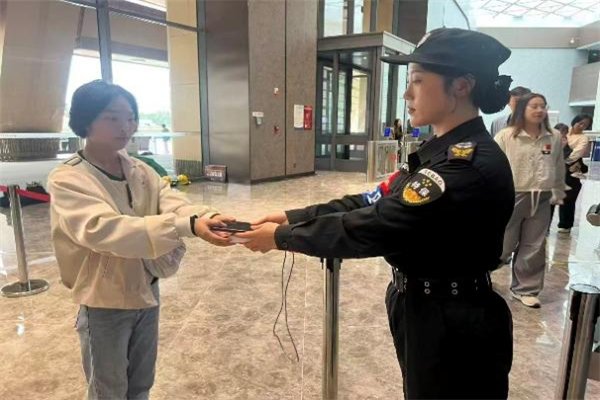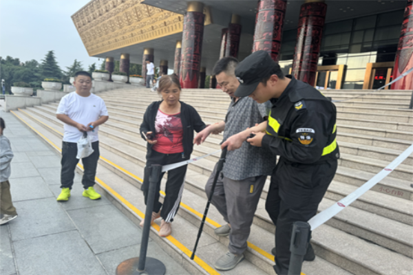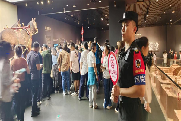 節(jié)日期間,特保大隊實行24小時輪班值守,全體隊員全情投入安保工作。一是嚴(yán)把入口關(guān)。安檢隊員嚴(yán)守各場館入口安檢關(guān)口,細(xì)致排查易燃易爆、管制刀具等違禁物品。僅殷墟博物館、中國文字博物館、漢字公園3處,日均完成超4萬余人次安檢,精準(zhǔn)攔截多起違禁品,筑牢“危險物品不入園”的堅實防線。二是強化內(nèi)部巡邏。館內(nèi)隊員加密巡邏頻次,既重點盯防文物展柜等安全要害,又聚焦客流易聚集區(qū)域。實時疏導(dǎo)擁擠人群,有效防范各類安全風(fēng)險。三是維護現(xiàn)場秩序。游客熱點區(qū)域,隊員遇人員飽和時,及時引導(dǎo)游客分批次有序游覽,保障良好秩序。四是提供暖心幫助。特保隊員專注引導(dǎo)行人安全通行。遇到老年游客或攜帶重物的游客,主動上前攙扶、協(xié)助搬運行李,以貼心舉措傳遞安保溫度。