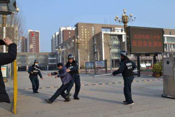 為切實(shí)強(qiáng)化校園安保工作,提升保安隊(duì)員對(duì)突發(fā)性暴力事件的反應(yīng)和處置能力, 3月15日,人防三大隊(duì)校園二中隊(duì)組織保安隊(duì)員在安陽市第八中學(xué)進(jìn)行了防恐安全演練。
