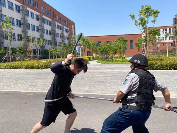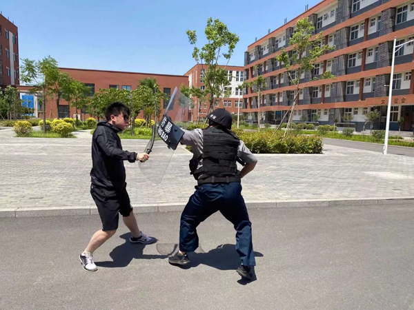 此次演練背景設(shè)置為:在安定祥和的氣氛中,保安正在門崗執(zhí)勤。9時30分許,一男子來到校門口,要求進(jìn)入學(xué)校。保安在問其緣由后,依照規(guī)定拒絕其入內(nèi)。就在這時,該男子突然強行闖崗。保安見狀,疾步擋在男子前面,男子用棍棒向保安襲來,保安手持盾牌抵擋。男子見無法傷到保安,轉(zhuǎn)身沖向院內(nèi)的教學(xué)樓。保安沖到男子面前,用鋼叉將其牢牢控制住,在同事的幫助下迅速合力將“歹徒”制伏。