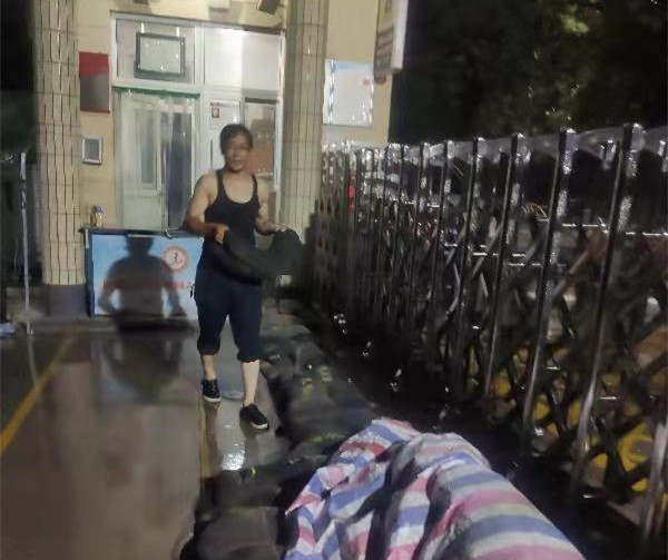 零點(diǎn)五十分,雨勢(shì)突然變大,短短十幾分鐘的雨量,已經(jīng)把學(xué)校門(mén)口的慢車(chē)道全部淹沒(méi),積水馬上就要涌入校園。雨情就是警情,汛情就是命令。防汛排險(xiǎn),刻不容緩。何濤立刻打上雨傘,開(kāi)始用防汛沙袋封堵大門(mén),由于雨下的很急,雨傘多次被打落,他直接把雨傘扔到一邊,雙手搬起了沙袋,很快便壘起了一面沙墻,及時(shí)將雨水堵在校門(mén)之外。