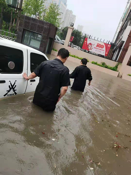 中原銀行受災(zāi)***為嚴(yán)重,洪水從車庫出入口,水流湍急,洶涌下灌,樓梯間水花翻滾,掛起一條條瀑布,看不清臺(tái)階邊緣!值班人員聞?dòng)嶑R上行動(dòng),迅速把押運(yùn)所用槍支、彈藥,車輛停放到安全位置。早上6點(diǎn)地下二層已近灌滿,洪水在地下一層肆虐,金庫重地危險(xiǎn)!雖有八名值班人員******投入戰(zhàn)斗,但勢(shì)單力薄,難當(dāng)洪水漫灌。7點(diǎn)40分,其余隊(duì)員陸續(xù)到崗,迅速投入戰(zhàn)斗。