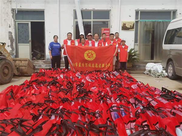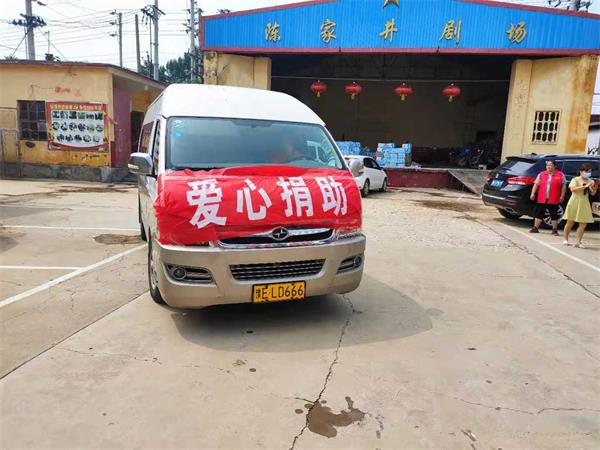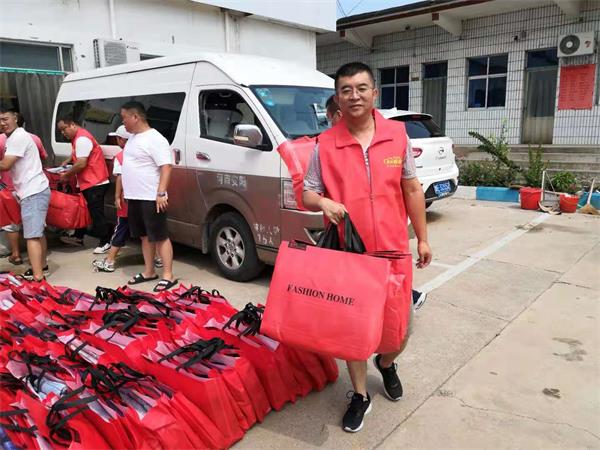 8月1日上午10時,藍盾駕校的中巴車載著350條夏涼被駛?cè)胧転?zāi)嚴重的殷都區(qū)曲溝鎮(zhèn)陳家井村委會,為村民們送來了急需的災(zāi)后生活用品。