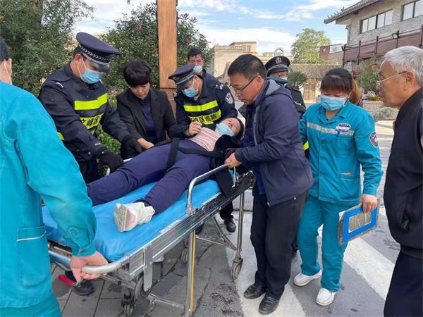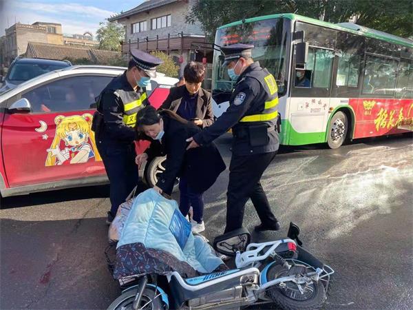 10月11日上午9時許,人防一大隊文峰巡防中隊班長楊科,隊員鄭天龍,王***清等9名隊員,例行巡邏到文峰北路與三道街交叉口時,路上突發(fā)一起交通事故,事故導致一名婦女摔倒在地,見此情形,隊員及時停車上前查看情況。