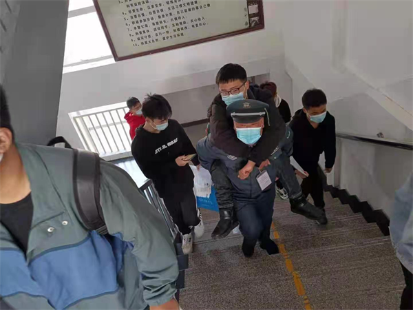 10月30日上午9點,在安陽市第八中學(xué)教師資格證考試入場前,看到一位校園保安將一名考生從一樓背上四樓,在場的考生、監(jiān)考老師對這位校園保安的舉動嘖嘖稱贊。