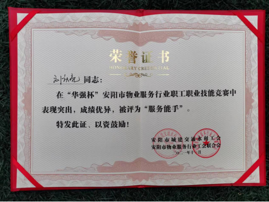 11月16日上午,在華強城隆重舉行的2021年安陽市物業(yè)服務(wù)行業(yè)職工技能“華強杯”競賽中,鼎誠物業(yè)公司榮獲2021年“華強杯”安陽市物業(yè)服務(wù)行業(yè)職工技能競賽“******組織獎”。劉慶亮、康長青獲得“服務(wù)能手”獎;蘇俊強、康長青獲得“******選手”稱號。