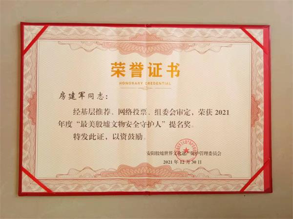 2021年12月31日上午,殷墟管委會(huì)在殷都區(qū)******南三樓舉行“***美殷墟文物安全守護(hù)人”頒獎(jiǎng)暨“殷墟”官網(wǎng)開通慶典儀式。人防二大隊(duì)駐龍安殷墟文物安全網(wǎng)格巡邏隊(duì)房建***同志獲得“***美殷墟文物安全守護(hù)人”提名獎(jiǎng),受到龍安殷墟文物安全網(wǎng)格化管理工作簡(jiǎn)報(bào)通報(bào)表揚(yáng),安陽殷墟世界文化遺產(chǎn)保護(hù)管理委員會(huì)頒發(fā)了榮譽(yù)證書。