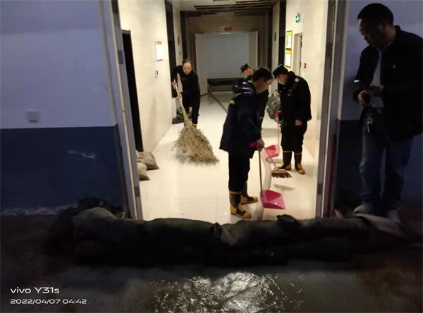 4月6日晚上十一點(diǎn),人防一大隊駐聯(lián)通公司東區(qū)崗點(diǎn)中、夜班的隊員交接完工作之后,夜班值班隊員杜懷濤、孟慶春開始接班后的正常巡樓工作。當(dāng)他們巡邏到負(fù)二層時,聽到有水流的聲音,職業(yè)的敏感提醒他們,有管道跑水,順著流水的聲音巡去,果不其然,負(fù)二層中央空調(diào)系統(tǒng)供水管道破裂,管道里的水不停向外噴射,如果不及時處置,會引發(fā)負(fù)二層注水,給客戶造成財產(chǎn)損失。兩位值班隊員馬上通知監(jiān)控中心和值班班長,值班班長邱文濤接到報警后迅速向中隊長董紅衛(wèi)匯報情況,同時安排夜班同志到現(xiàn)場處理積水,董紅衛(wèi)趕赴現(xiàn)場后和值班隊員一起配合******的維修人員處置險情,經(jīng)過近五個小時的奮戰(zhàn),險情得到妥善解決。