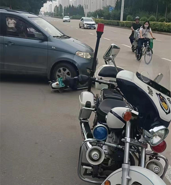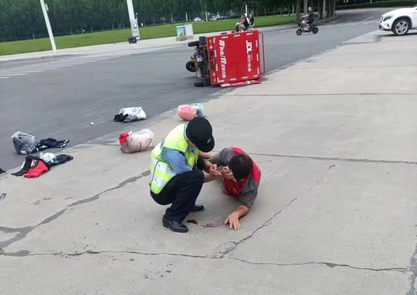 7月15日下午3點(diǎn),特保大隊(duì)四中隊(duì)隊(duì)員宋超、侯振國(guó)巡邏來(lái)到弦歌大道與平原路交叉口時(shí),發(fā)現(xiàn)該地發(fā)生一起交通事故,一輛出租車與三輪快遞車相撞。隊(duì)員們迅速停下查看情況,只見(jiàn)快遞哥額頭******血不止,宋超迅速?gòu)目诖刑统鲂l(wèi)生紙幫快遞哥傷口止血。隨后,他們通知隊(duì)員司清瑄、郭東梁前來(lái)支援。