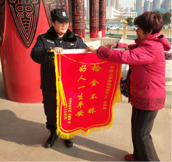 “感謝特保隊員,你們的品德太高尚了,你們讓我相信了還是好人多?!?020年1月1日,家住博書苑的王愛素女士一看到特保大隊派駐在中國文字博物館的隊員徐環(huán)琪,便激動地說出這番話,并將一面寫有“好人一生平安,拾金不昧”的錦旗,送到徐環(huán)琪手中。這是怎么一回事呢?