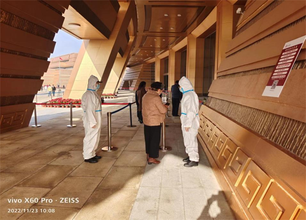中國(guó)文字博物館續(xù)建工程開(kāi)館以來(lái),特保大隊(duì)負(fù)責(zé)館里的安保工作。隨著2022年11月23日疫情防控形勢(shì)日益嚴(yán)峻,防疫工作更要做到位,期間隊(duì)員們都自告奮勇,義無(wú)反顧地沖在防疫一線,為參觀的游客筑起防疫的銅墻鐵壁。