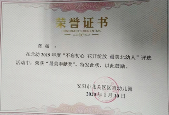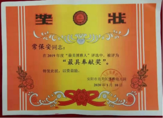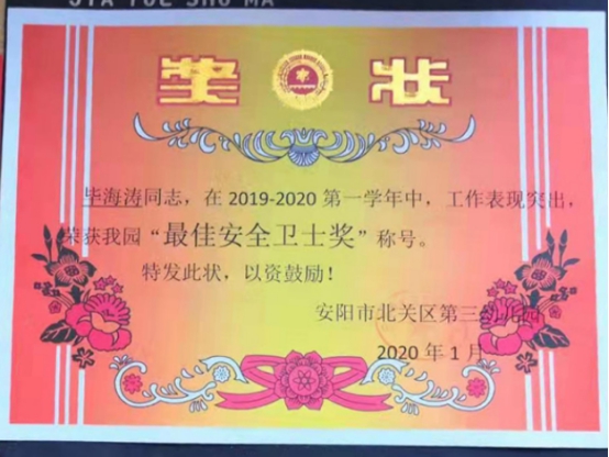 獲獎隊員中,駐北關(guān)區(qū)區(qū)直幼兒園張強在2019年度“不忘初心 花開綻放 美麗北幼人”評選活動中,榮獲“美麗奉獻獎”;駐北關(guān)區(qū)博雅幼兒園常保安在“美麗博雅人”評選中,被評為“杰出奉獻獎”;駐北關(guān)區(qū)第三幼兒園畢海濤榮獲“杰出安全衛(wèi)士獎”稱號。自該大隊擔(dān)負北關(guān)區(qū)教育系統(tǒng)安全保衛(wèi)工作以來,駐各小學(xué)、幼兒園保安員夯實保安技能,開展應(yīng)急處置預(yù)案演練,認真履行職責(zé),為創(chuàng)建平安校園做出了突出貢獻。