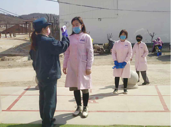 圖為趙麗霞在為幼兒園老師測量體溫。