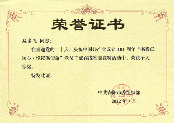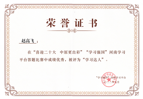 對(duì)于平時(shí)怎樣學(xué)習(xí),趙高飛有自己的學(xué)習(xí)心得,他認(rèn)為,學(xué)習(xí)要貴在勤奮、貴在鉆研、貴在有恒,每天早上******件事,就是打開學(xué)習(xí)強(qiáng)國平臺(tái),翻閱感興趣的時(shí)事新聞和行業(yè)動(dòng)態(tài),完成每天的學(xué)習(xí)任務(wù),從不占用工作時(shí)間學(xué)習(xí),都是在上班之前就完成了。對(duì)于參加比賽如何獲得好的成績,趙高飛有一套自己的學(xué)習(xí)竅門。一是要堅(jiān)持,每天堅(jiān)持把當(dāng)日學(xué)習(xí)積分做完,總結(jié)學(xué)習(xí)方法和學(xué)習(xí)技巧。二是勤練習(xí),四人賽、雙人對(duì)戰(zhàn)是關(guān)鍵,要勤練習(xí)各個(gè)答題模塊,熟能生巧。三是有訣竅,他整理出一整套學(xué)習(xí)題庫達(dá)5000多題,并利用碎片時(shí)間翻看熟記于心,他把各種類型的題分類總結(jié),錯(cuò)題、易錯(cuò)題收藏起來,反復(fù)練習(xí)、各個(gè)擊破,***終,他克服一切困難,集中一切精力用5個(gè)小時(shí)時(shí)間,通關(guān)“強(qiáng)國總題庫”共4202題。四是重交流,他加入了“學(xué)習(xí)強(qiáng)國”******學(xué)習(xí)聯(lián)盟、“學(xué)習(xí)強(qiáng)國”河南學(xué)習(xí)聯(lián)盟等學(xué)習(xí)微信群,和學(xué)習(xí)達(dá)人們一起探討答題經(jīng)驗(yàn)和技巧