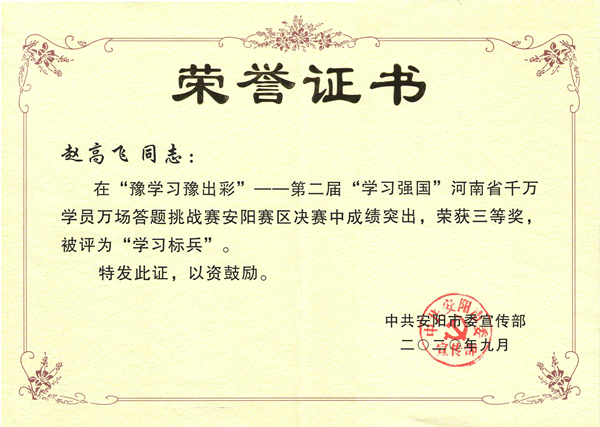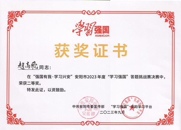 趙高飛,35歲,中共黨員,本科學(xué)歷,現(xiàn)任鼎信子公司副經(jīng)理,自“學(xué)習(xí)強(qiáng)國”平臺(tái)上線以來,趙高飛學(xué)習(xí)成績屢創(chuàng)新高,先后榮獲2020年度學(xué)習(xí)強(qiáng)國挑戰(zhàn)賽安陽市賽區(qū)決賽“個(gè)人三等獎(jiǎng)”,2021年度安陽市黨員干部在線答題競賽“個(gè)人三等獎(jiǎng)”,2022年度學(xué)習(xí)強(qiáng)國河南學(xué)習(xí)平臺(tái)“喜迎二十大、中原更出彩”答題比賽“周達(dá)人”及“學(xué)習(xí)達(dá)人”,2023年度“強(qiáng)國有我 學(xué)習(xí)興安”學(xué)習(xí)強(qiáng)國答題挑戰(zhàn)賽安陽市決賽“個(gè)人二等獎(jiǎng)”,2023年度學(xué)習(xí)強(qiáng)國河南學(xué)習(xí)平臺(tái)“貫徹二十大精神、建設(shè)現(xiàn)代化河南”強(qiáng)國答題比賽“周達(dá)人”。學(xué)習(xí)從來都不是一蹴而就的,這些成績的獲得,是趙高飛日積月累堅(jiān)持學(xué)習(xí)的成果。