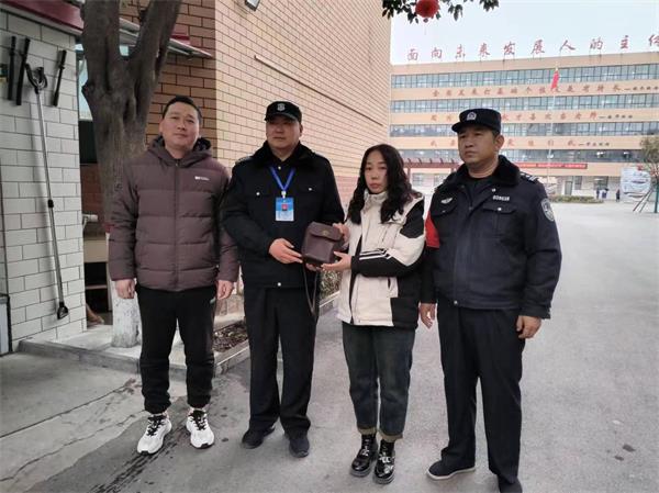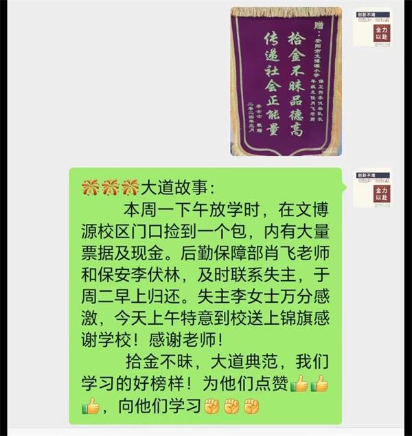 事情的原委是這樣的,3月4日下午放學(xué)時,保安員李伏林在文博源校區(qū)門口執(zhí)勤時,看到地上有一個棕色挎包,經(jīng)撿起查看,發(fā)現(xiàn)內(nèi)有身份證和很多信封,信封內(nèi)都是現(xiàn)金。于是他回到門崗將包妥善保管起來,并向后勤保障部肖飛老師匯報了情況,二人隨設(shè)法聯(lián)系失主,后通過警察將失物交到了失主手中。次日早,當(dāng)李女士看到自己遺失的物品感激萬分:“因為您的拾金不昧,我的身份證和許多重要物品失而復(fù)得,非常感謝!”