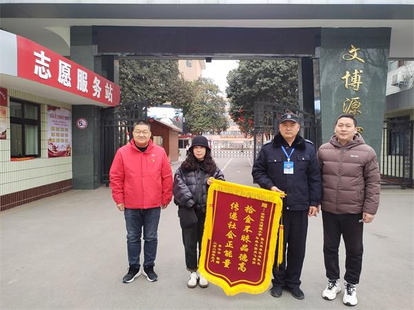 3月6日上午,安陽李女士拿著“拾金不昧品德高 傳遞社會正能量”的錦旗,來到安陽市人民大道小學(xué)教育集團(tuán)文博源小學(xué),對安陽市洹河保安公司人防二大隊駐該校保安中隊長李伏林和年級主任肖飛老師連聲道謝。