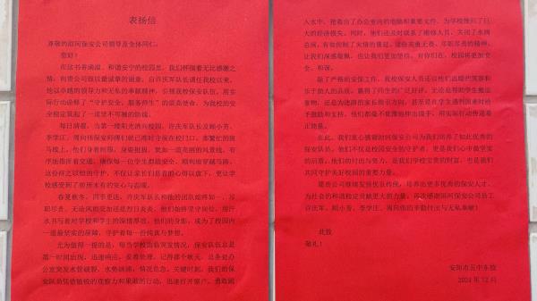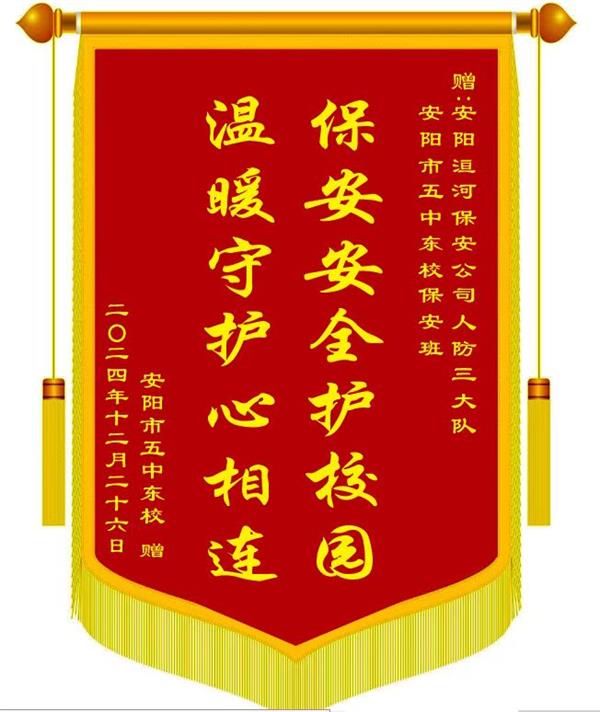 12月27日上午10時許,安陽市五中東校有關領導專程將一面寫有“保安安全護校園 溫暖守護心相連”的錦旗和一紙表揚信送到公司,感謝公司人防三大隊派駐學校保安班一直以來對維護校園平安所作出的辛勤努力和付出,營造了安全、有序、文明、和諧的環(huán)境,為構(gòu)筑平安和諧校園作出了重要貢獻。