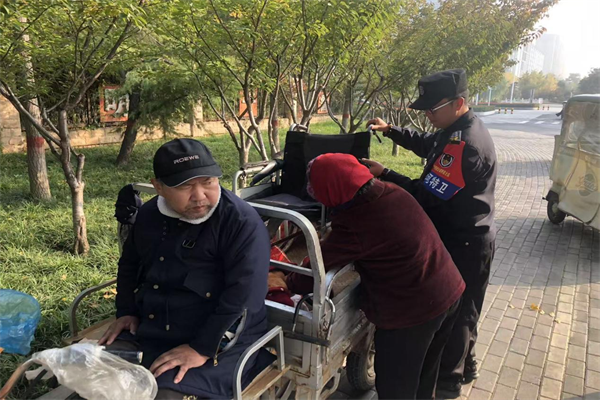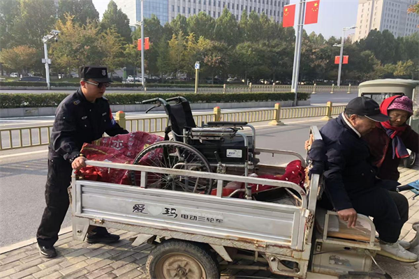 11月1日上午,特保隊(duì)員李志強(qiáng)在中院南門(mén)外發(fā)現(xiàn)有兩名信訪群眾身體不便前來(lái)中院上訪,他們年紀(jì)較大且腿腳不便,李志強(qiáng)耐心溝通了解后,主動(dòng)上前攙扶并幫助他們把輪椅裝上三輪車(chē),協(xié)助老人推動(dòng)三輪車(chē)前去信訪大廳。
