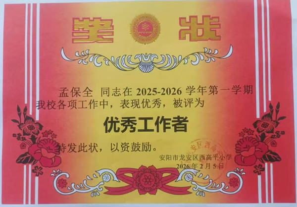 近日,龍安區(qū)西高平小學(xué)召開表彰大會,人防四大隊派駐該校保安員孟保全獲評2025年度******工作者。他始終秉持“哪里需要就往哪搬”的初心,以一崗多能的服務(wù)、默默堅守的付出,成為師生心中***可靠的 “校園守護者”、***信賴的 “暖心老孟”。