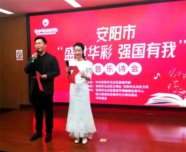 2021年10月17日下午,安陽市“盛世華彩 強(qiáng)國有我”音樂詩會(huì)在恒大綠洲社區(qū)新時(shí)代文明實(shí)踐站二樓宣講中心隆重舉行。安陽市總工會(huì)宣教部部長(zhǎng)、市職工作家協(xié)會(huì)主席、市作家協(xié)會(huì)副主席、市文聯(lián)兼職副主席張艾敏觀看表演。公司培訓(xùn)中心王曉丹同臺(tái)獻(xiàn)藝。