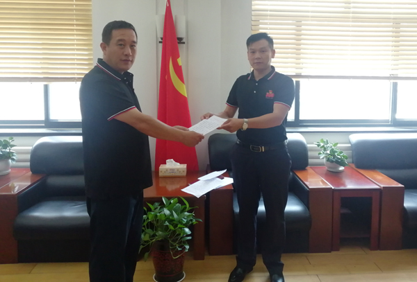 圖為黨員在向支部書記遞交入黨申請(qǐng)書。